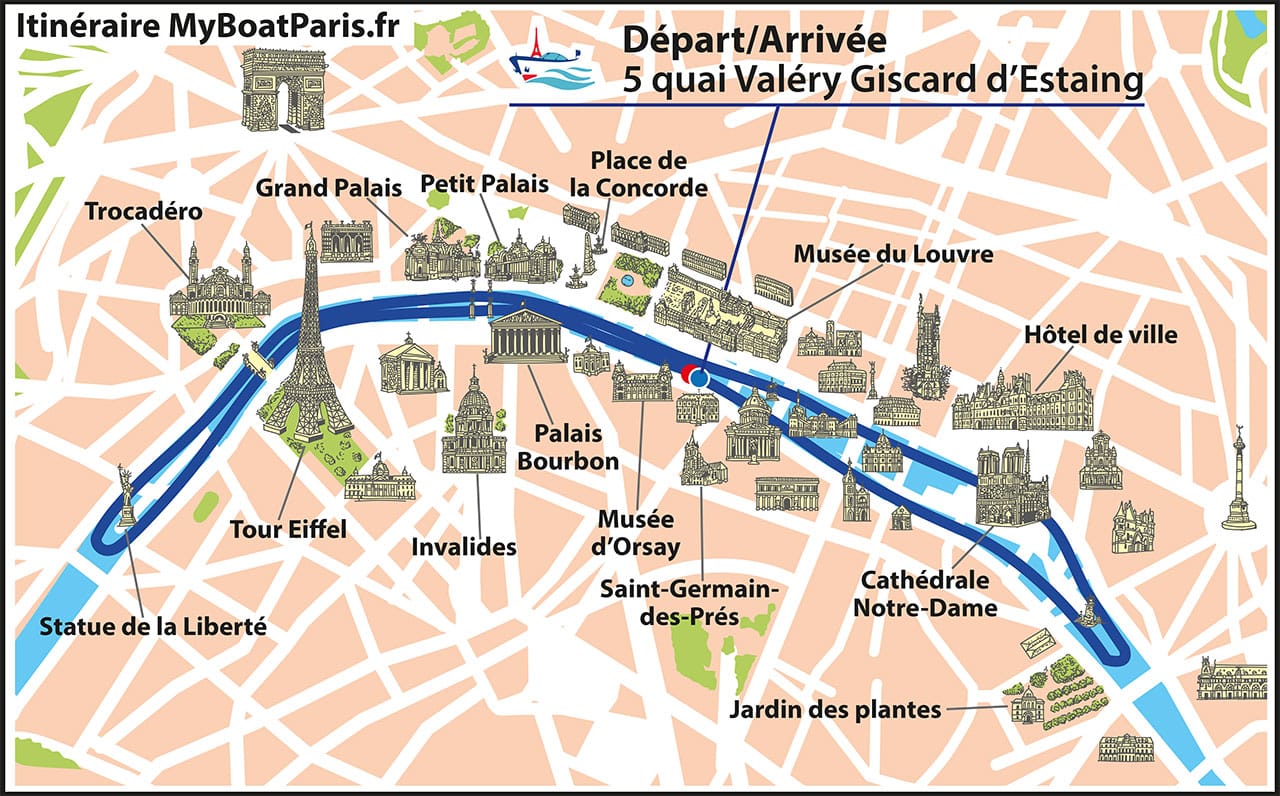 Embarquez pour une découverte avec MY BOAT PARIS. Nos croisières vous mèneront au cœur de Paris : Musée d’Orsay, Saint-Germain-des-Prés, Cathédrale Notre-Dame, Hôtel de Ville, Musée du Louvre, Place de la Concorde, Tour Eiffel…